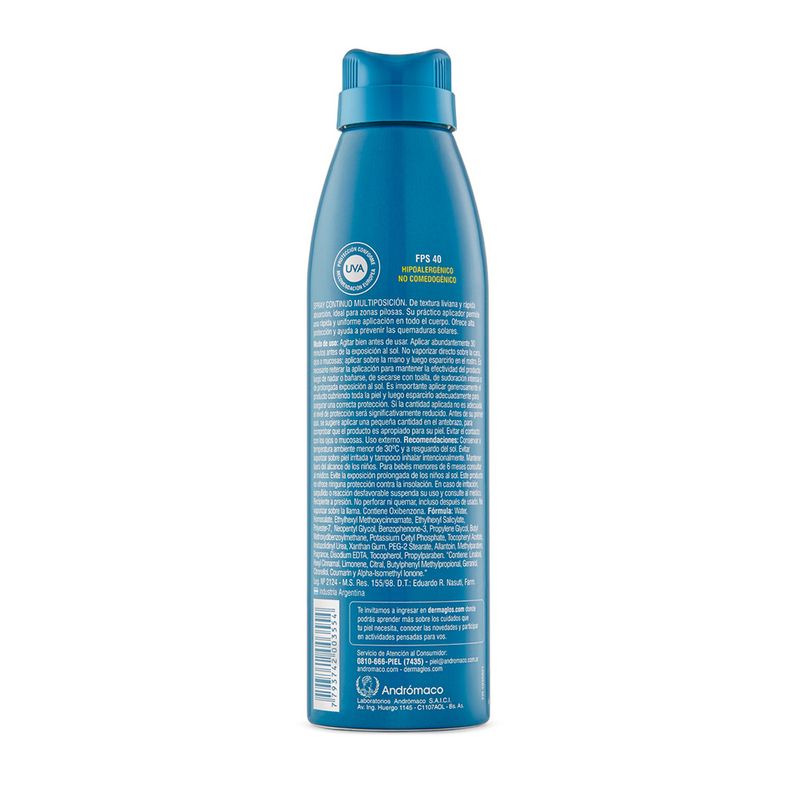 Protector solar spray continuo. Sin efecto graso. Rápida Absorción. Resistente al agua. Testeado dermatológicamente